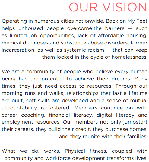 I have the opportunity to drive Back on My Feet's mission to empower people struggling with homelessness and substance abuse disorders.